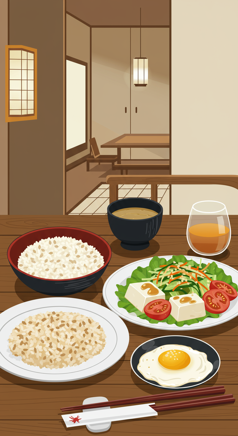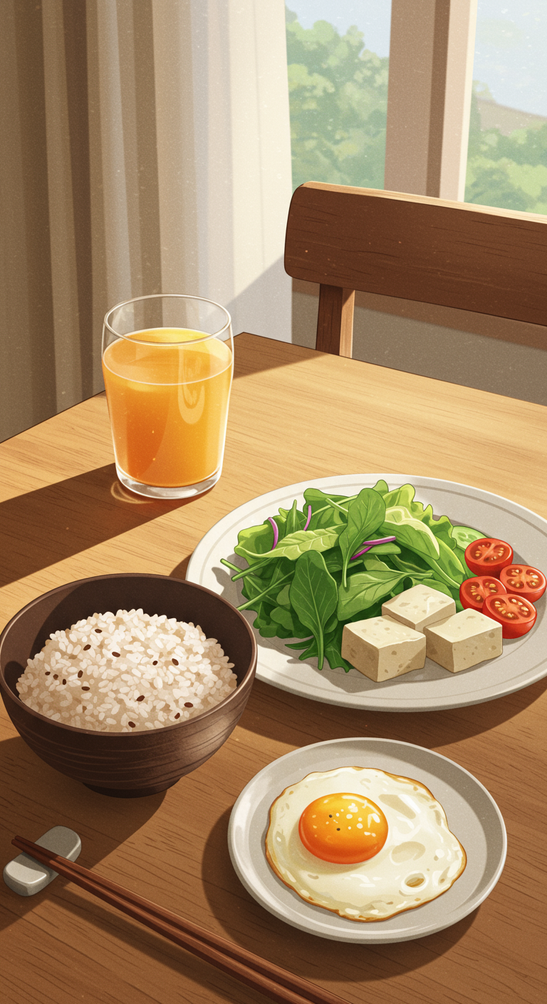 - 점심: 현미밥 + 닭가슴살 구이 + 시금치나물 + 된장국